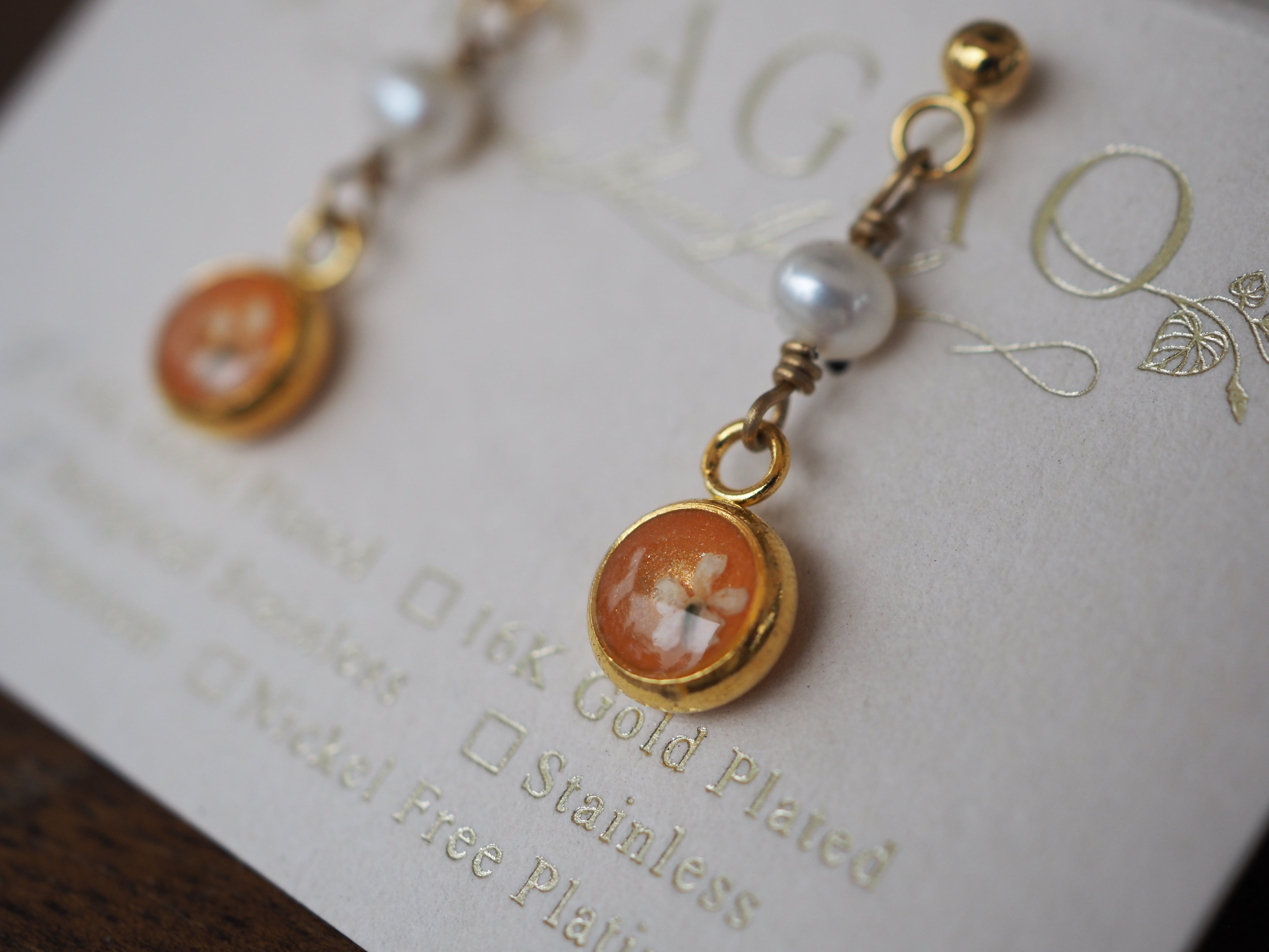 金具の素材は低アレルギー性のニッケルフリーメッキサージカルステンレスを使用しています。イヤリングにはシリコンのゴムカバーをお付けし、心地よい装着感を実現しました。
